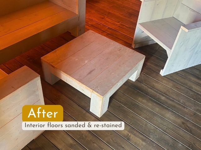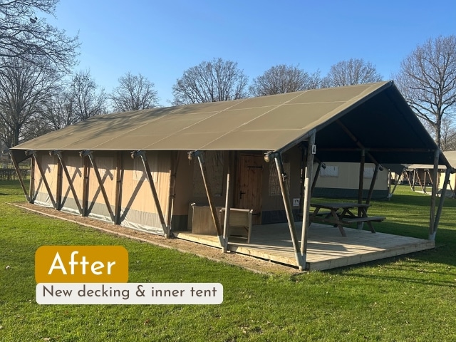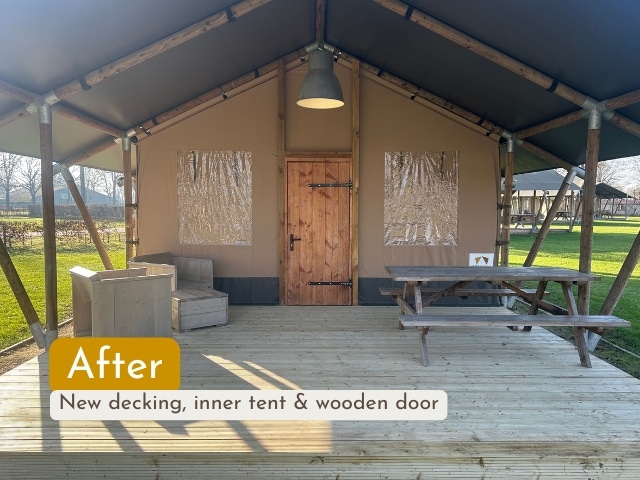 At Recreatiepark De Leistert, we carried out a refurbishment project for ten Wood AN5 safari tents. The inner tents were replaced, floors were sanded and re-stained, decking boards renewed and the existing Douglas doors were adjusted and reinstalled.